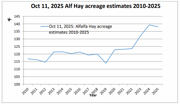 - 2025産アルファルファの収穫は終了しています。日照時間は、日に日に短くなり、圃場は休眠状態へ入って行きます。今年は1番刈りの大宗が雨あたり品となり、2番刈り3番刈りは順調に収穫された印象です。3番刈り後半から4番刈りまでは、山火事の影響や、散発的な降雨があり、品質にばらつきが見られました。今年の貨物の成分分析表を確認する限り、今年は例年よりも高成分貨物が少なく、単収を狙った貨物が多い印象となっています。収穫を終えた圃場では、取引価格に回復が見込まれないため、他作物への転作がすすんでおり、ここ2年間で当地での作付面積は40%以上減少していると見込まれています。