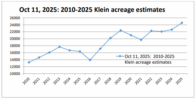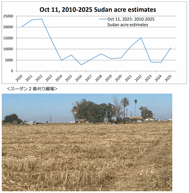 今年は、5番刈りまで行った生産者が多かったです。不安定な天候の影響で、品質にはばらつきがあり、低級品も多く収穫されました。10月11日の IIDの発表によれば、灌漑面積は24,595エーカー、昨年同期は22,624エーカー、先月は23,901エーカーでした。